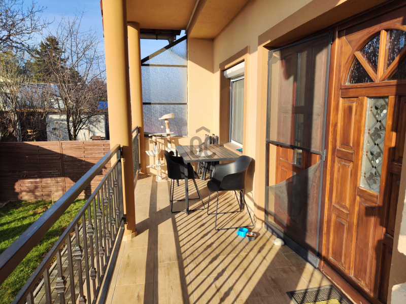 A 327 m²-es telek teljesen körbekerített, rendezett, gondozott, és egy fedett kiülővel is kiegészül. A ház környezetét térkő burkolat, terasz, valamint a felső szinten erkély teszi még komfortosabbá.