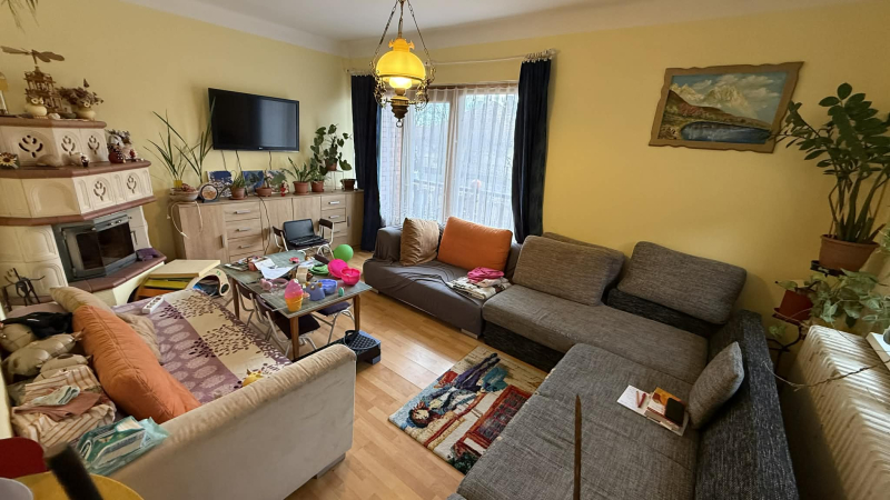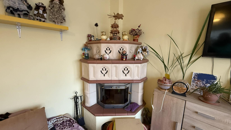 Im Erdgeschoss des Hauses befinden sich ein heller, gemütlicher Wohnbereich mit wunderschönem Kachelofen, ein Schlafzimmer, ein Esszimmer, eine Küche, ein Badezimmer und eine Garage.