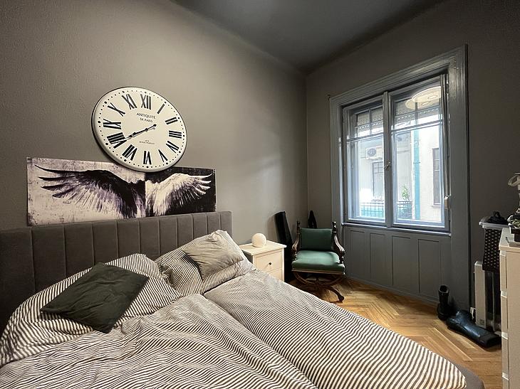 A szoba faparkettás, a vizeshelyiségek pedig járólaposak.