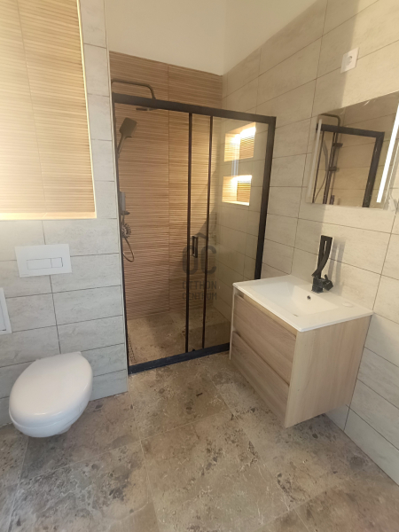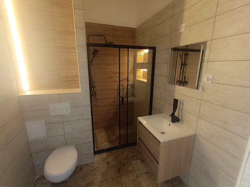 A fürdőszoba újra lett építve. A lakás vízvezetékei cserélve lettek, épített Walk-in zuhanykabin, fali Geberit wc, mosdószekrények, mosógép kiállás és elszívó ventilátor lett kialakítva. A meleg vizet villanybojler biztosítja.