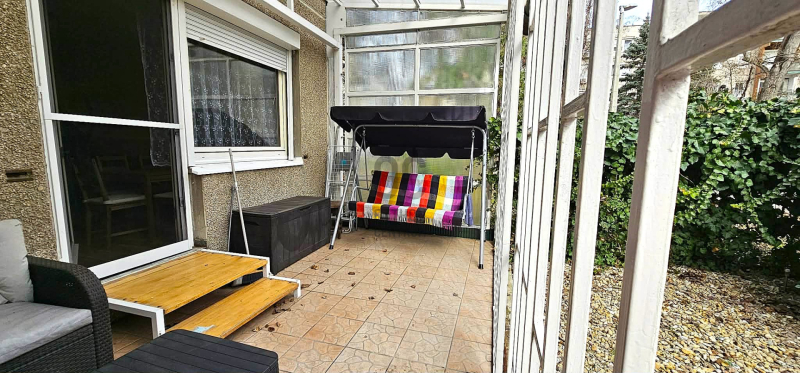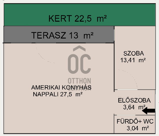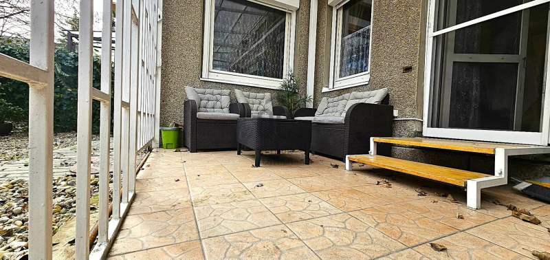 A lakáshoz tartozik egy 13 nm-es terasz plusz egy 22,5 nm-es elkerített kert.