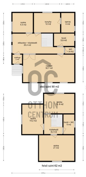 - Földszinten /90 m2/: 2 tágas hálószoba, konyha + étkező, nappali, fürdőszoba, külön WC, közlekedő, kamra helyiségek kerültek kialakításra