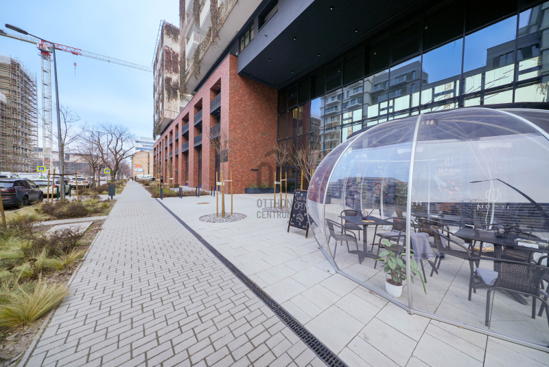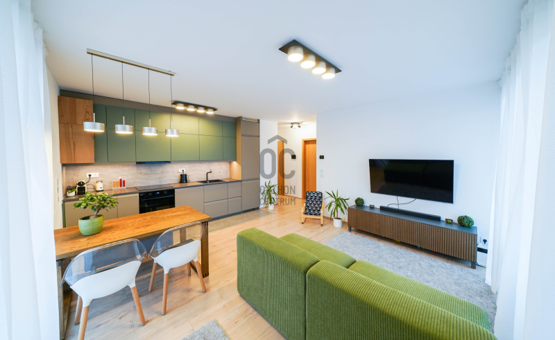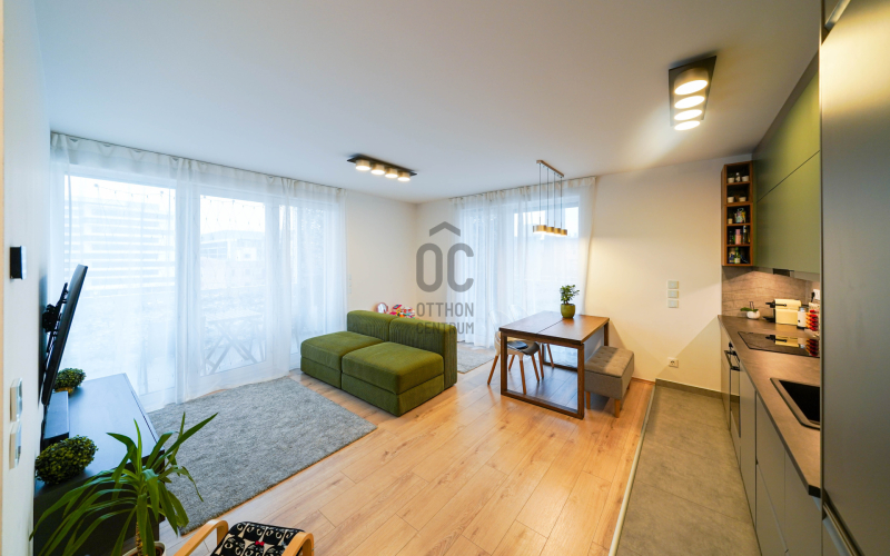 Az okosotthon applikációval felszerelt lakás nappali és két hálószobával, hatalmas üvegfelületekkel rendelkezik és igényes bútorokkal, magas kategóriájú gépekkel, teljeskörűen berendezett. A beépített bútorok, a gépesített konyha az ár részét képezik, a mobilis bútorzat opcionálisan megvásárolható.