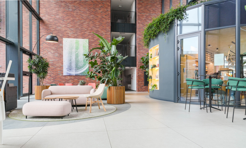 A bejáratnál található különleges kialakítású, hangulatos kávézó, akár az utcafrontról, akár a belső aulából is elérhető az itt lakók részére.