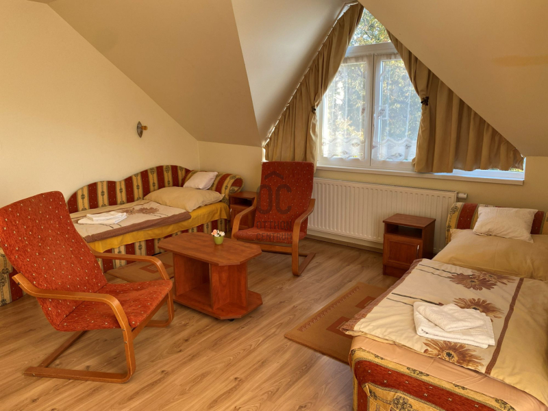 Az emeleti tetőtérben négy vendégszoba található, mindegyik saját fürdőszobával ellátott, TV-vel, kis hűtővel és éjjeli szekrényekkel felszerelt. A szobák összesen 8 fő befogadására alkalmasak, de mindegyik pótágyazható, így akár 13 fő elszállásolása is megoldható.