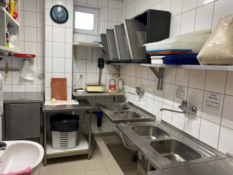 A földszinten a következő helyiségek találhatók: egy 36 m²-es nagyterem 30 fő befogadására, egy 25 m²-es kisebb terem, valamint egy 45 m²-es középső, pulttal kialakított vendégtér, összesen kb. 60 fő kényelmes fogadására alkalmas. A két nagyobb vendégtér között elhelyezkedő cserépkályha nemcsak a fűtésben segít, hanem kellemes hangulatot is teremt. A vendégek számára külön női és férfi mosdók állnak rendelkezésre. A teljesen felszerelt melegkonyha mellett külön pizzakonyha, fehér- és fekete mosogató, zöldség- és húselőkészítő helyiségek, szárazáru raktár, hűtő- és tejtermék raktár, valamint göngyöleg raktár biztosítja a zavartalan működést. A dolgozók részére külön öltöző került kialakításra, amely saját WC-vel, mosdóval és zuhanyzóval felszerelt, valamint egy irodahelyiség is kialakításra került.