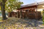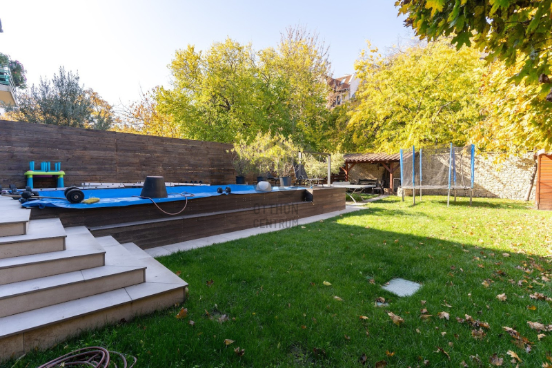 A házhoz tartozik egy 403 négyzetméteres telek, amely rendezett kerttel rendelkezik. A füvesített kertben kiépített öntözőrendszer, 3x5 méteres hőszivattyúval fűthető medence, fedett sütögető rész és egy kis faház tárolónak is megtalálható.