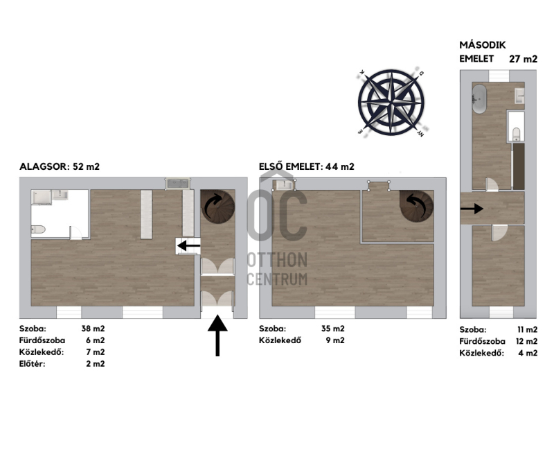 - Első szint: 44 m2, belmagasság 385 cm.