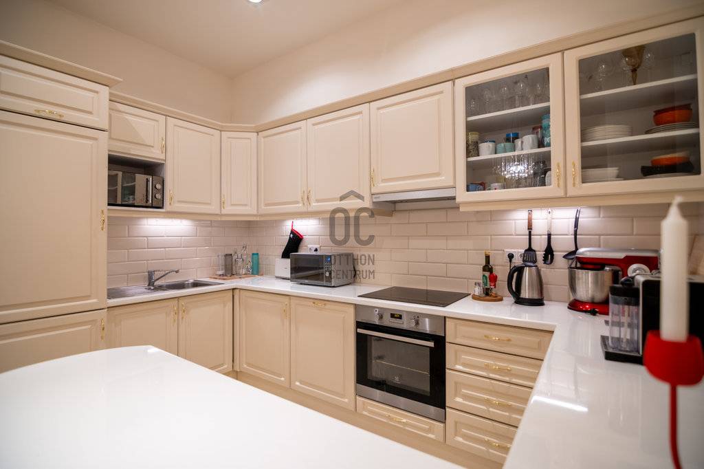 Az I. emeleti, polgári stílusú lakás tágas terekkel és kifinomult arányokkal rendelkezik, megjelenése elegáns és harmonikus. A letisztult színek kifinomult hangulatot és időtálló, nemes összhatást adnak. A szobákban klasszikus parketta, míg a lakás többi részén egységes stílusos járólap található. A délkeleti fekvésű lakásban három szoba közül kettő a Kígyó utcára, egy pedig a csendes belső udvar irányába néz. A konyha és az étkező egy nagyméretű térben kapott helyet, amely közvetlenül kapcsolódik a rendkívül tágas nappalihoz, ideális teret biztosítva a mindennapi élethez. A 20 négyzetméteres hálószobához tartozik egy közel 8 négyzetméteres gardrób is mely tolóajtókkal leválasztható a lakótértől. A második hálószoba a lakás északnyugati felében található és abban is helyet kapott egy beépített gardrób szekrény.