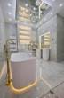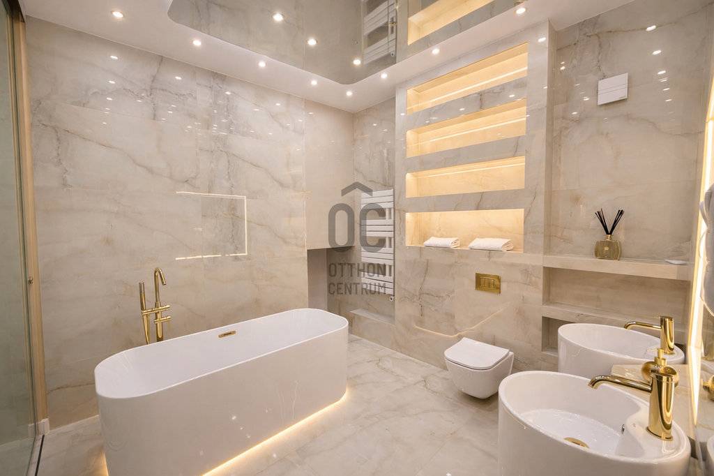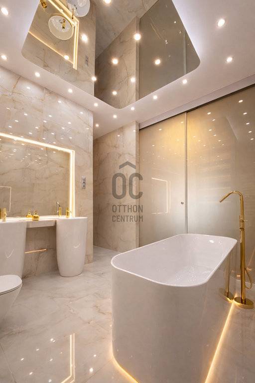 A két mosdóval és plusz zuhanyzóval rendeklező fő fürdőszoba ékessége egy szabadonálló, alsó szegélyében megvilágított Villeroy & Boch kád