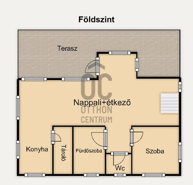 ■ A földszinten található a nappali, étkező, konyha, 1 szoba, egy fürdőszoba, Wc, kamra, terasz.