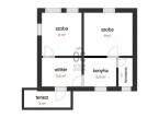 A fedett teraszon keresztül juthatunk a földszinti lakrészbe, ahol az előtérből két szoba, konyha étkezővel és fürdőszoba WC-vel található.