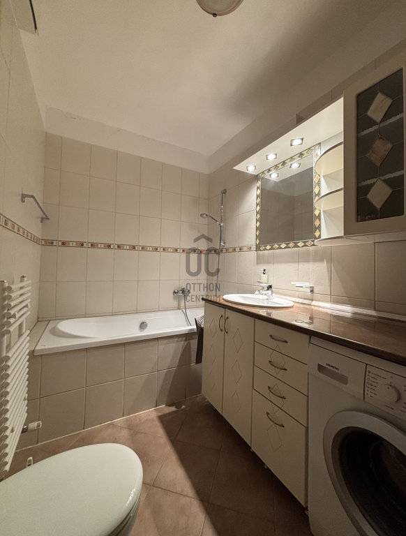 Rendkívül tágas a fürdőszoba is, melyben a sok tárolási lehetőség is rendkívüli, a nagy, beépített tükrös szekrény és a beépített mosógép mellett.