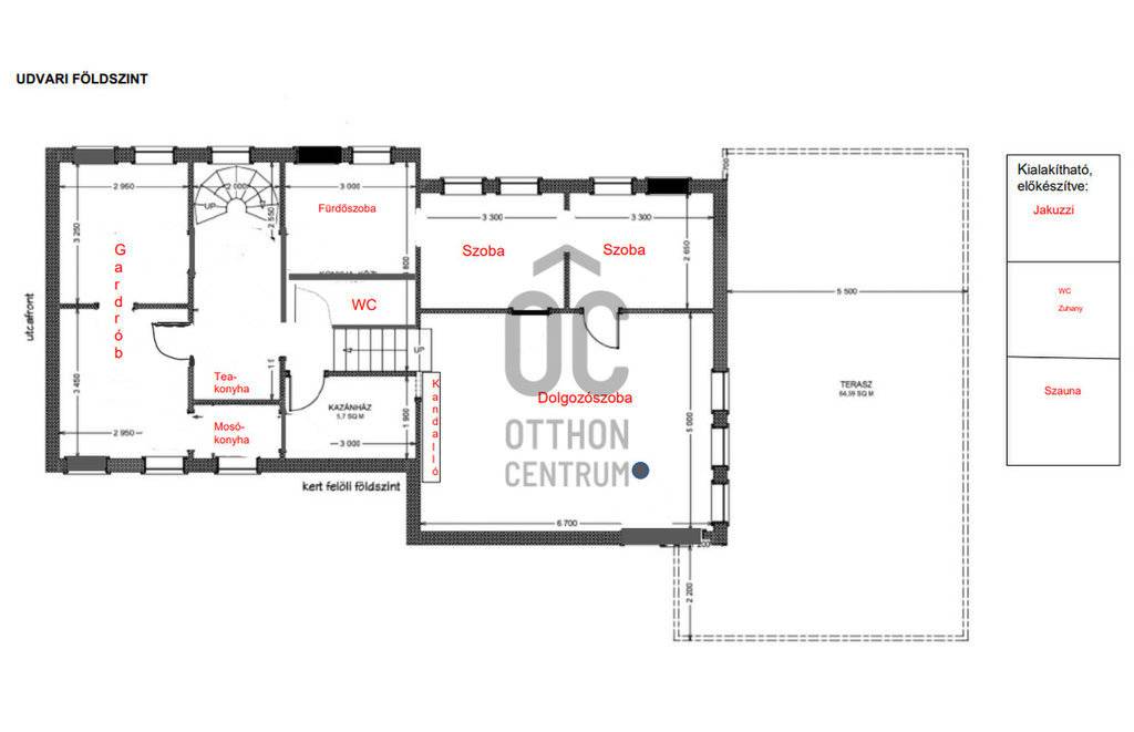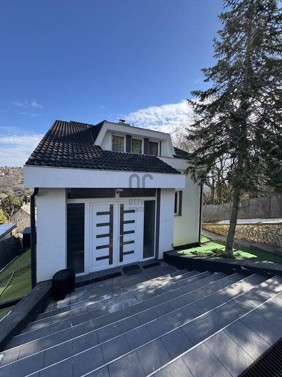 A kert teraszos kialakítású, örök panorámával Remetekertváros dombjaira. Jacuzzi és szauna előkészítés, napelem kiállás, gondozott zöldfelületek. Elektromos tolókapu, riasztórendszer, teljes közművesítés.