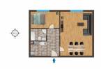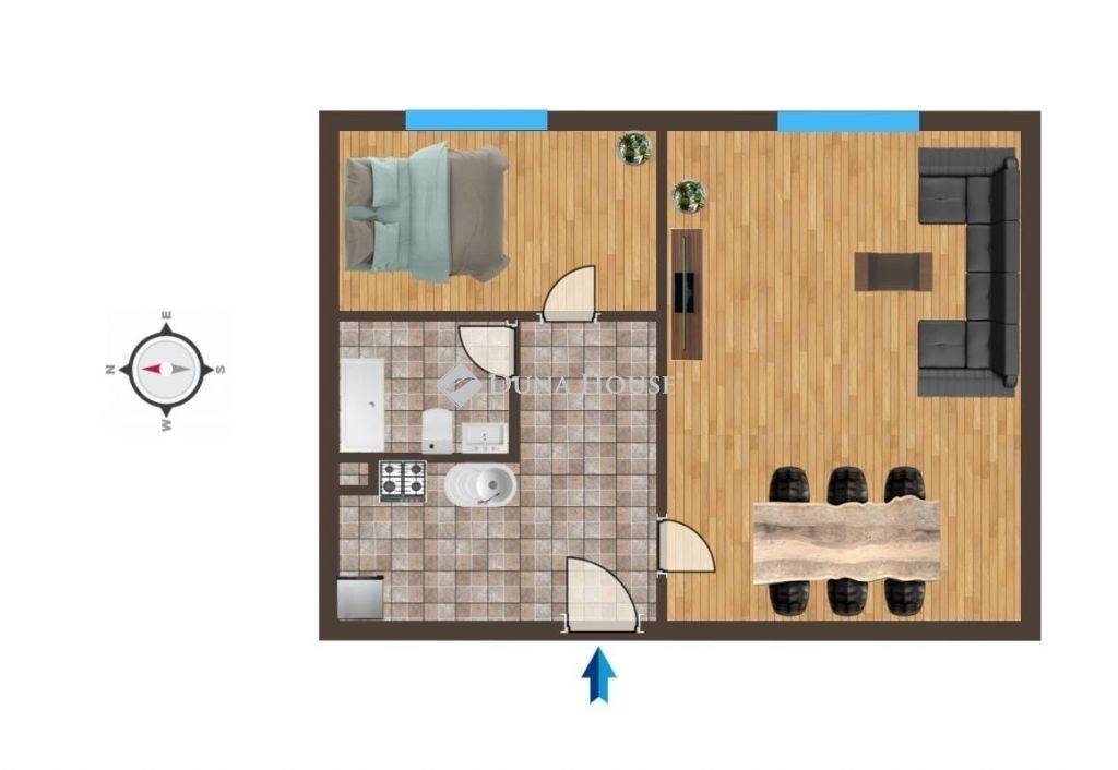 A lakás praktikus elrendezésű: egy tágas nappali, egy szép konyha, egy hangulatos szoba és egy fürdőszoba+wc alkotják, melyeket modern gépekkel felszerelt konyha egészít ki.