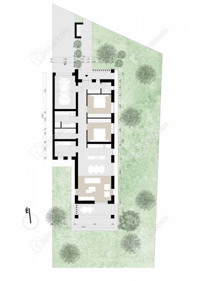 Helyiségek: amerikai konyhás nappali, 2 szoba, fürdőszoba WC-vel, 1 külön WC, előtér, közlekedő, gardrób, háztartási helység-gépészet, garázs, terasz 27,5 m².