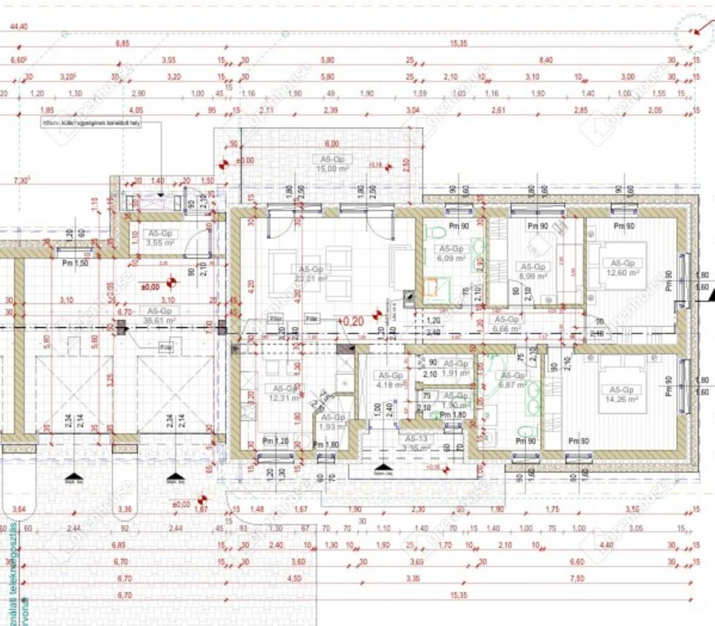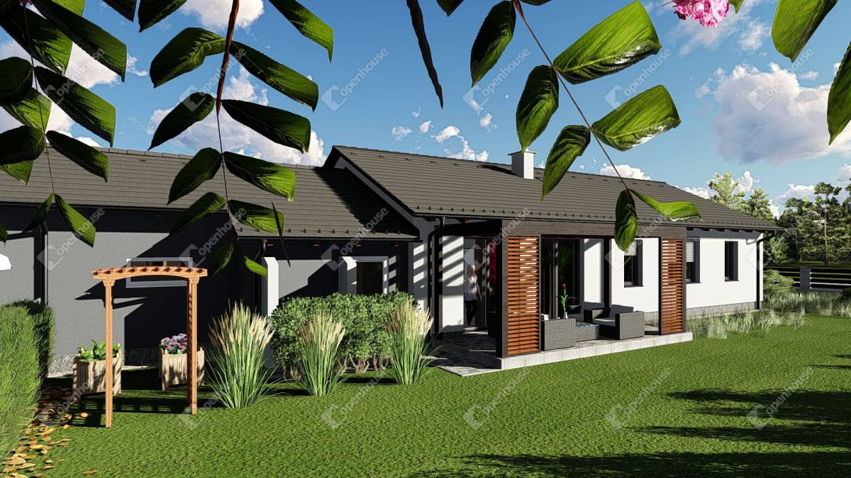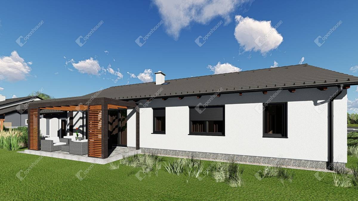 Helyiségek: amerikai konyhás nappali, 3 szoba, 2 fürdőszoba WC-vel, plusz 1 külön WC, szélfogó, közlekedő, gardrób, kamra, dupla garázs, gépészeti helyiség, terasz 15 m².