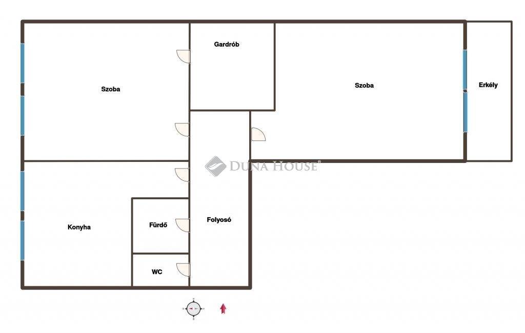 A lakás praktikus elrendezésű: két világos szoba, külön konyha, fürdőszoba, WC, gardrób és beépített szekrény biztosít kényelmes életteret.