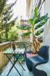 Ablakai és a napsütötte terasza a hátsó, örökzöld növényekkel beültetett kertre néznek, ahova a forgalom zaja nem hallatszik be.