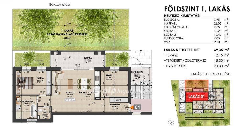 A földszinti lakások közvetlen kertkapcsolattal rendelkeznek (saját kert opcionálisan vásárolható), míg az emeleti lakások tágas erkéllyel és tetőkerttel biztosítanak extra életteret és kényelmet.