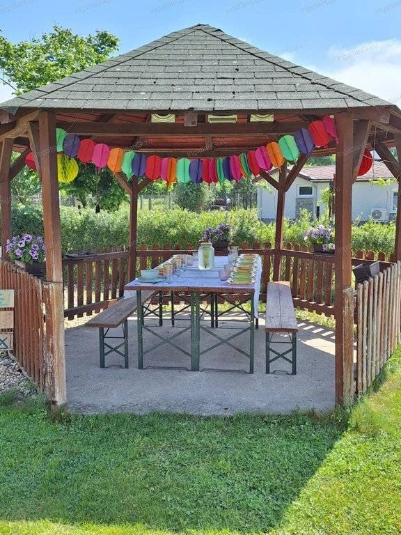 A füvesített udvaron 27 nm-es fűthető, könnyűszerkezetes tárolóval, kerti kiülővel, öntözőrendszerrel, fúrt kúttal.