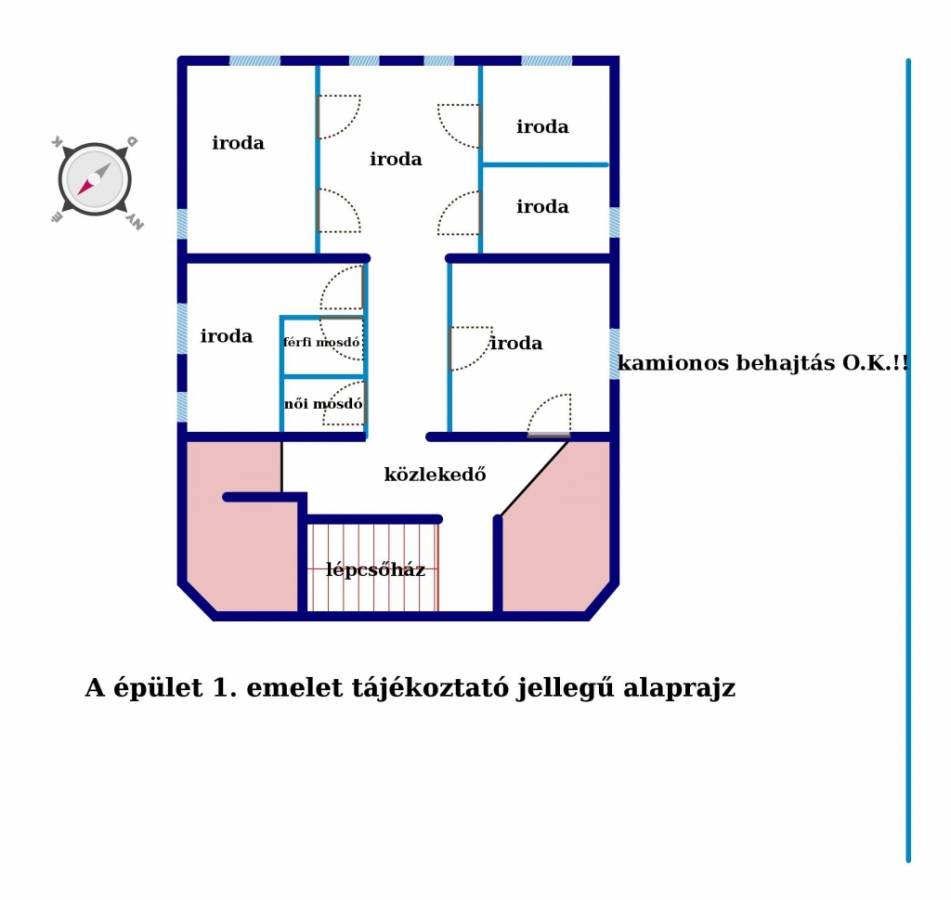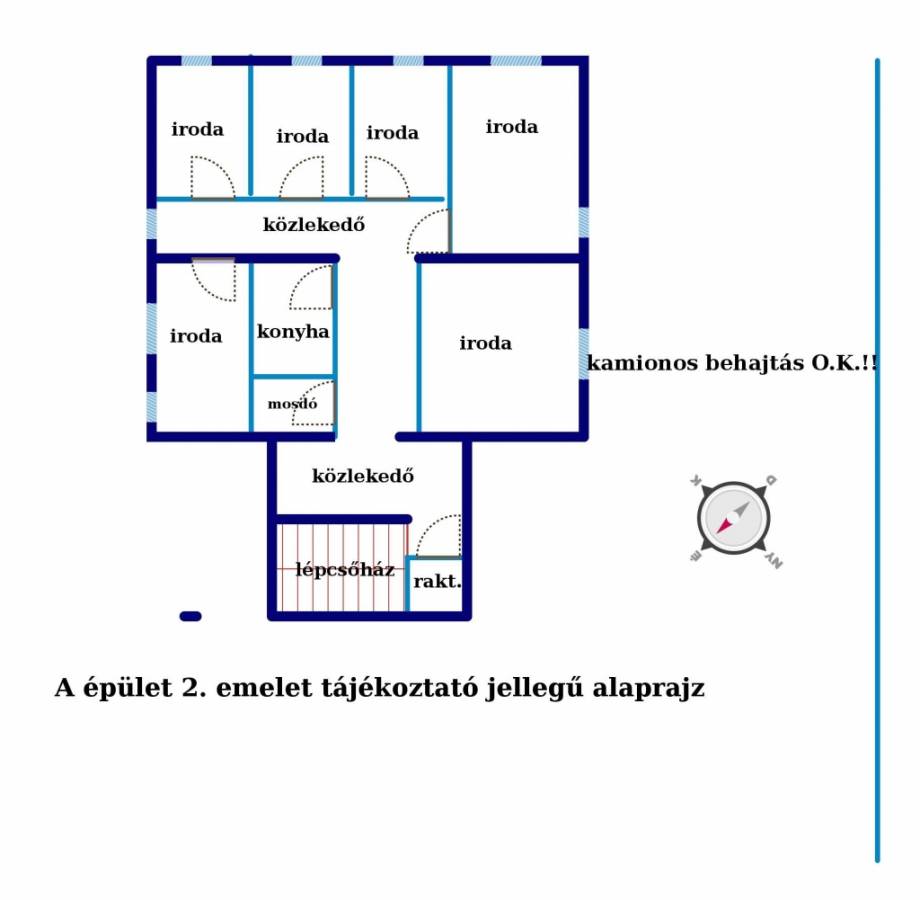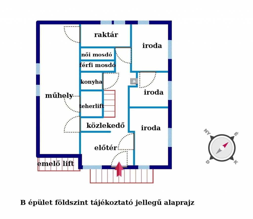 - 3 szintes, minden szinten mosdók, konyha, irodák, tárgyalók, raktárak, szerviz szobák