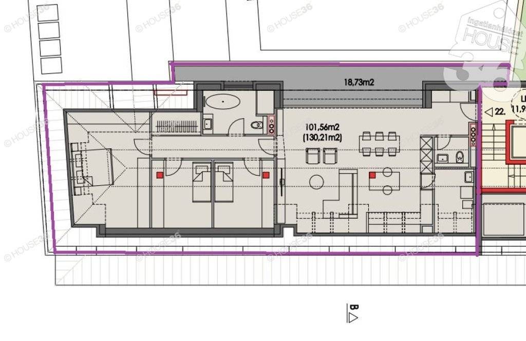 Az épület III. emeletén, bruttó 130,21 m2, nettó 101,56 m2 lakóterű, nappali + 3 szobás lakás, 18,73 m2 erkéllyel megvásárolható.