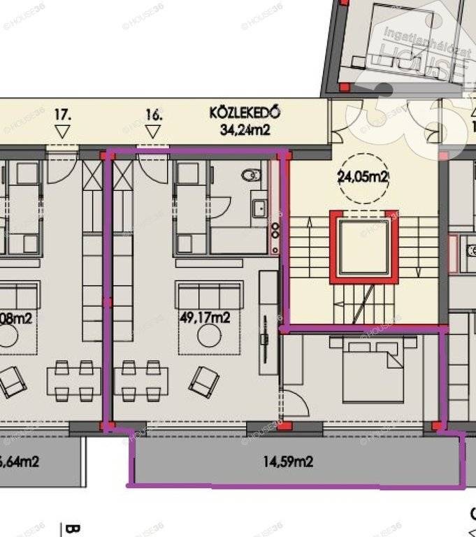 Az épület II. emeletén, 49,17 m2 lakóterű, nappali + 1 szobás lakás, 14,59 m2 erkéllyel megvásárolható.