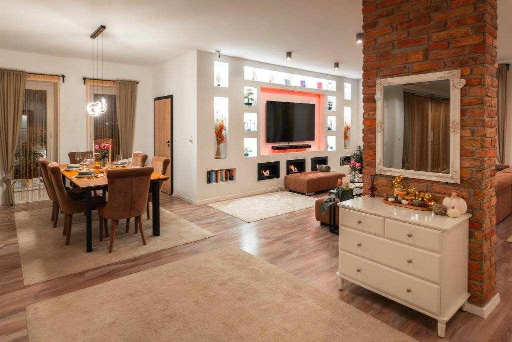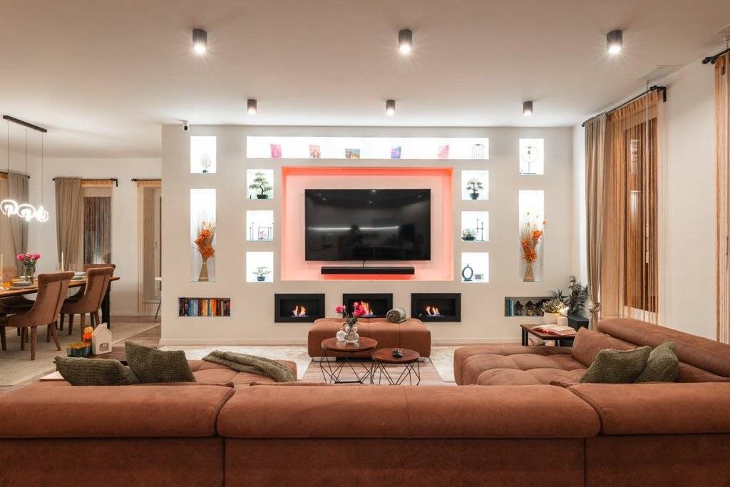 A ház belső kialakítása a modern eleganciát és a funkcionalitást ötvözi.