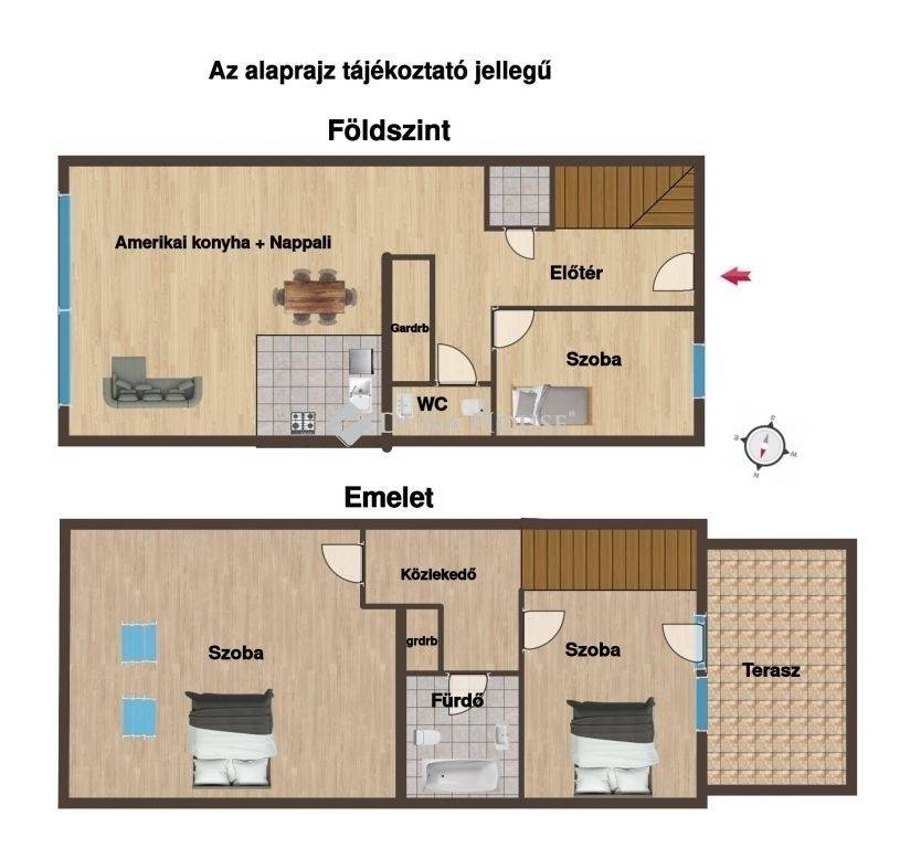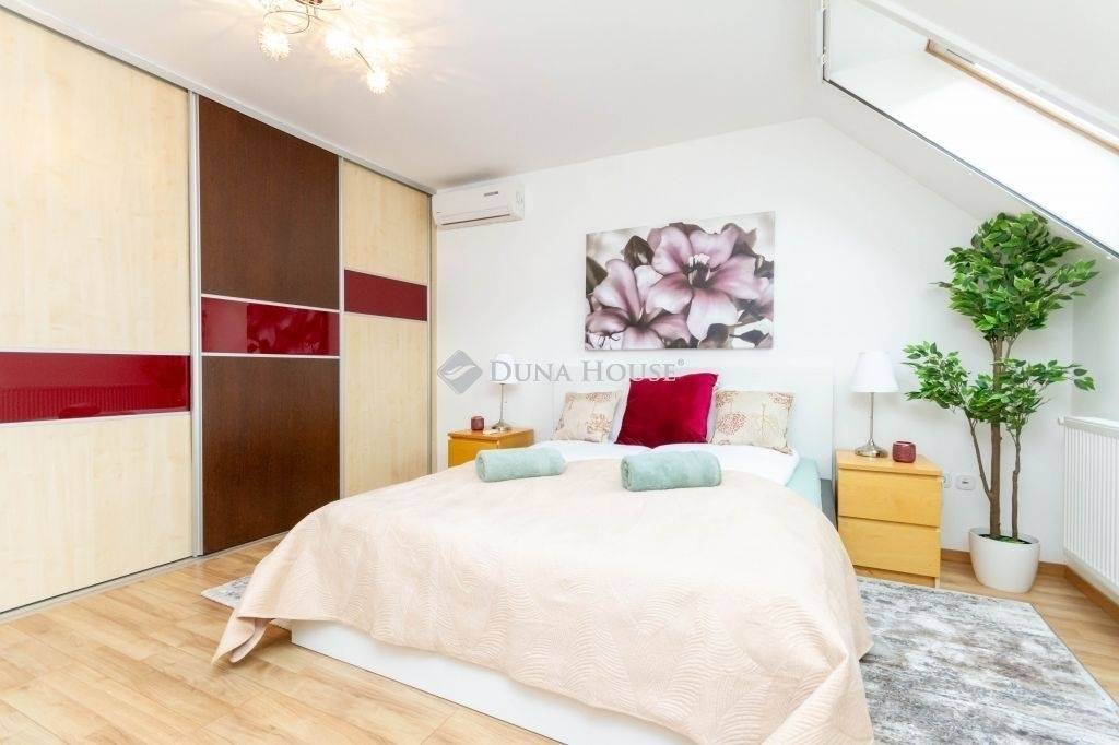 A lakás 2009-ben, emeletráépítéssel épült, mely lehetőséget adott a régi, hagyományos építési móddal épült házaktól eltérő, a mai modern igényeket kielégítő elrendezés kialakítására. Az alsó szinten előszoba, amerikai konyha + nappali, kamra, külön bejáratú félszoba, mellékhelyiség, gardróbok találhatóak, a kényelmes lépcsőn megközelíthető felső szinten pedig 2 db külön bejáratú szoba (1+1), terasz, fürdőszoba, gardrób helyezkedik el.