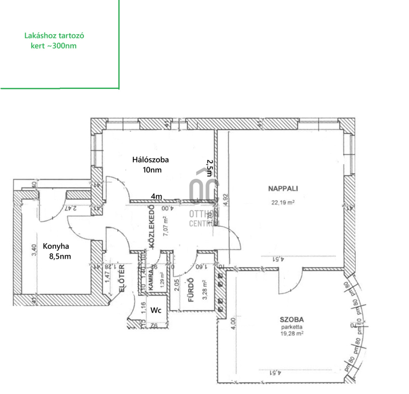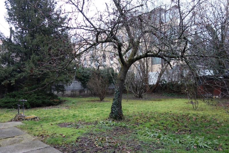 A szép, fenyőkkel és gyümölcsfákkal tarkított kertben ehhez a lakáshoz tartozik egy saját 350nm-s kertrész. Az 1. emeleten elhelyezkedő