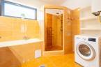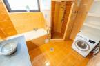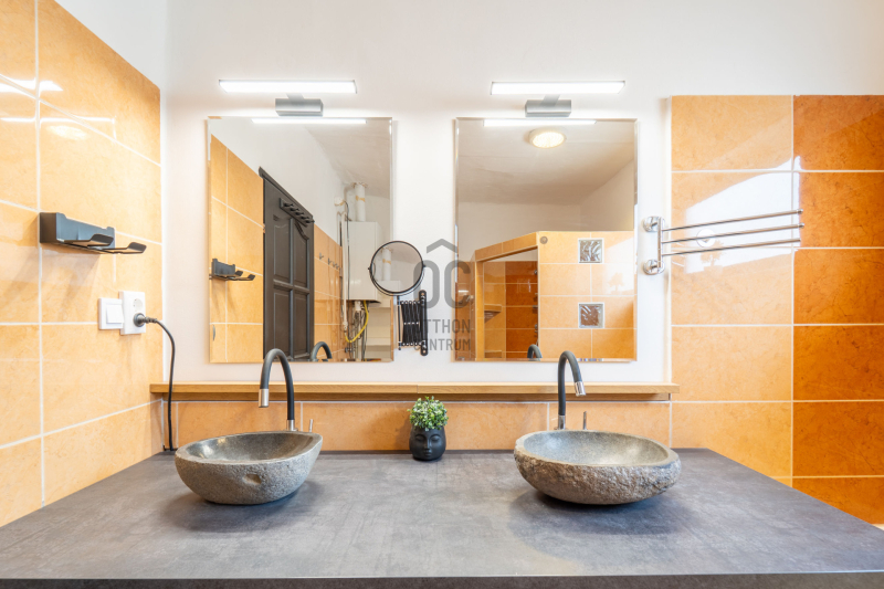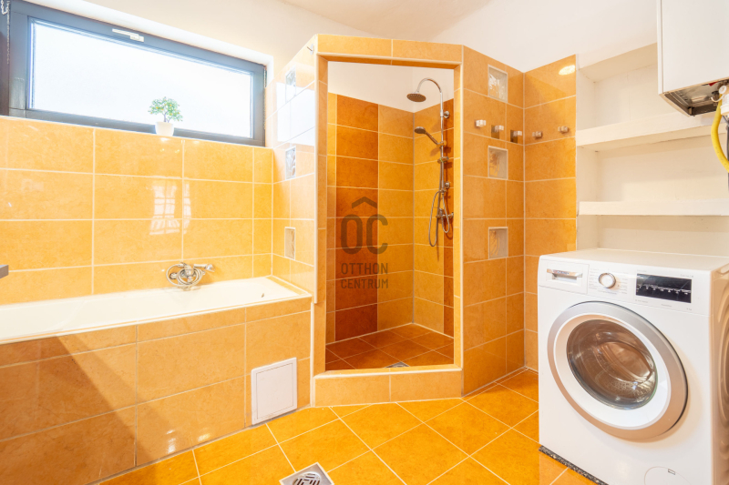 A fürdőszobában fürdőkád és épített zuhanyzó is helyet kapott, dupla mosdókagylóval.