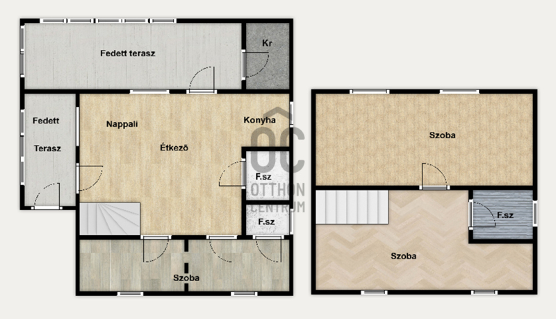 Az épület 2 szintes, nappali-konyha-étkező egy légtérben van.