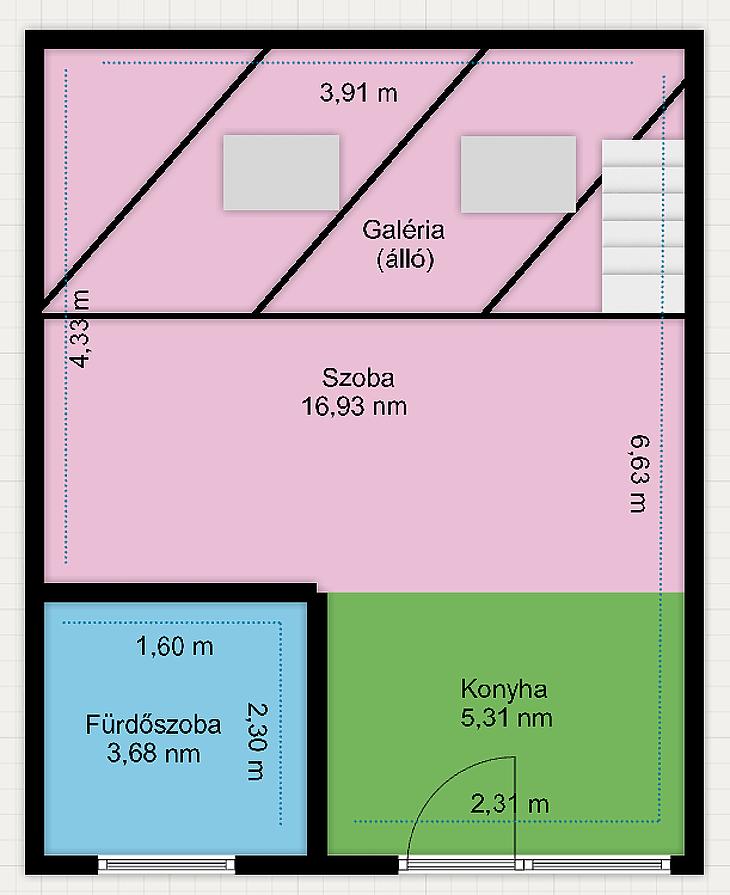 Belmagasságának köszönhetően a hasznos alapterületet (álló) galéria kialakításával növelték.