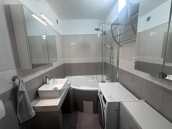 Konyhája ablakos, világos. A beépített bútorzat és a gépesítés a vételár részét képezi.