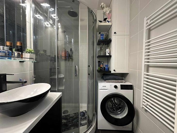 -A fürdőszoba burkolatai jó állapotúak, zuhanykabinnal felszerelt.