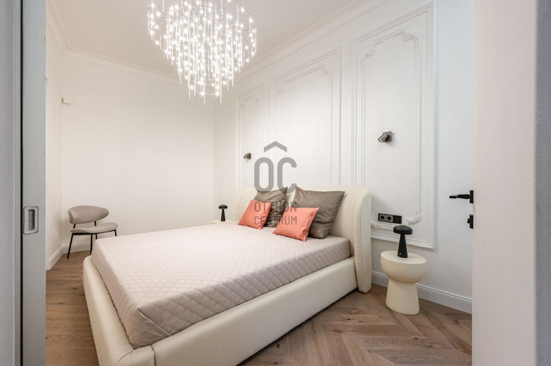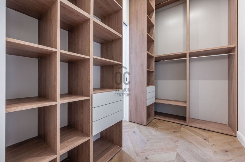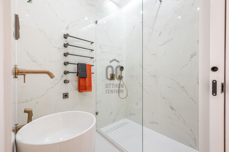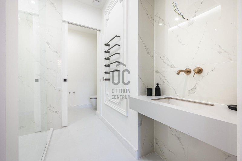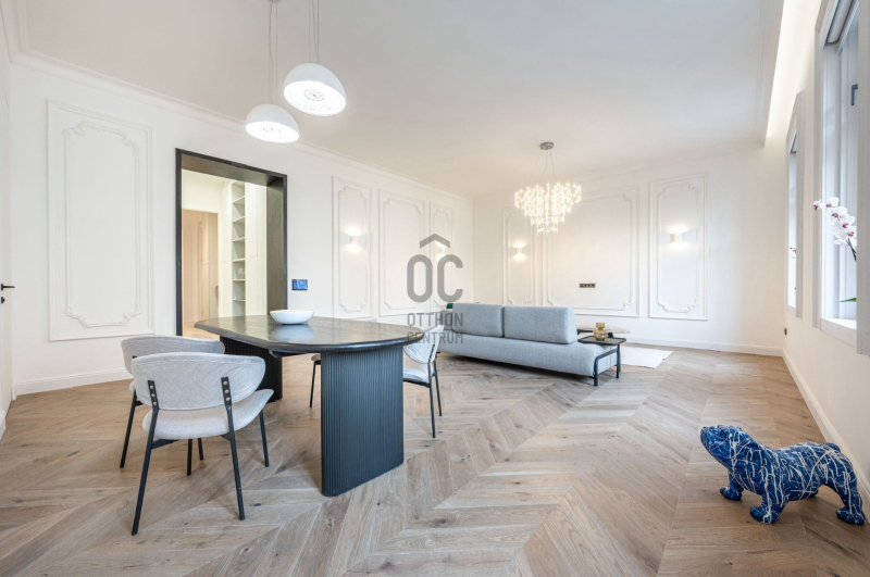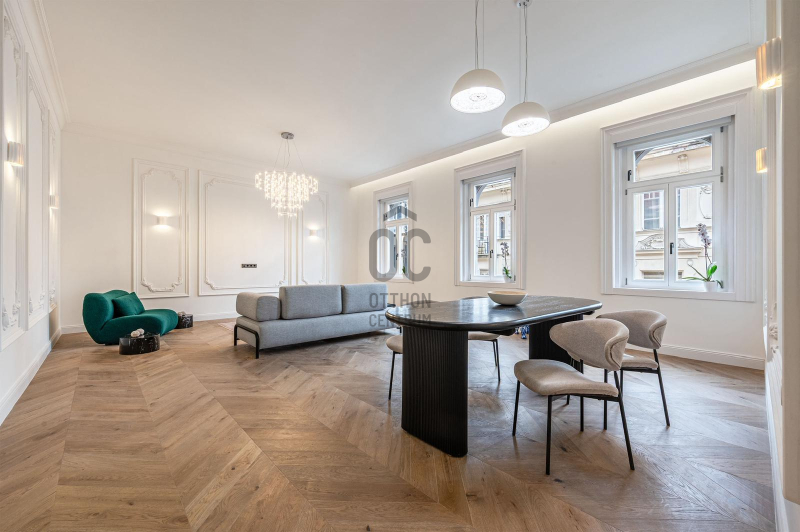 A patinás homlokzat mögött egy 104 m²-es, harmadik emeleti, délkeleti fekvésű rezidencia található, amely magas belmagasságával, igényes részleteivel és kifinomult belsőépítészeti megoldásaival valódi nagypolgári hangulatot áraszt. A gondosan felújított építészeti elemek és a prémium anyaghasználat elegáns, időtálló környezetet teremtenek.