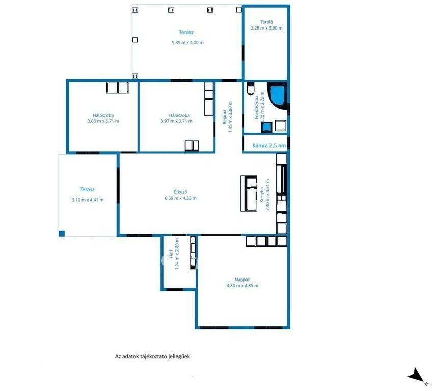 Az elektromos ellátás 3x32 amperrel biztosított, a gáz az utcában elérhető. A hátsó tároló és kazánház különálló épületrészben kapott helyet, amely praktikus megoldást jelent a mindennapokban. Jelenleg ez a rész nincs rajta a hivatalos térképen, ezért az ingatlanra csak piaci hitel vehető fel.