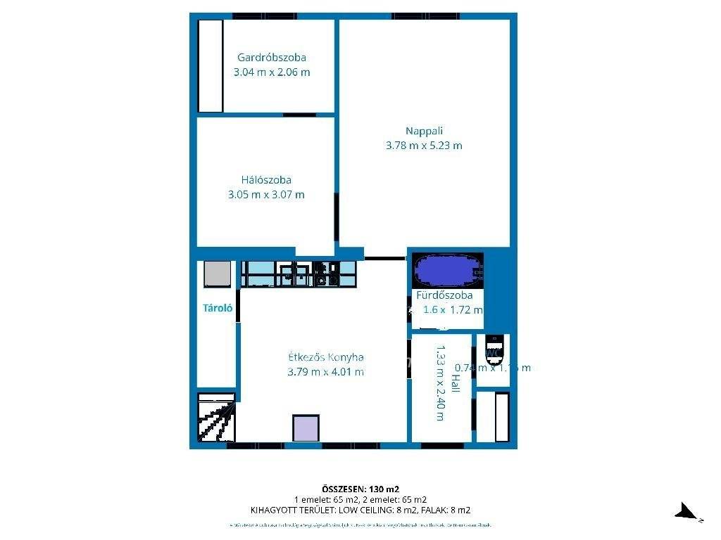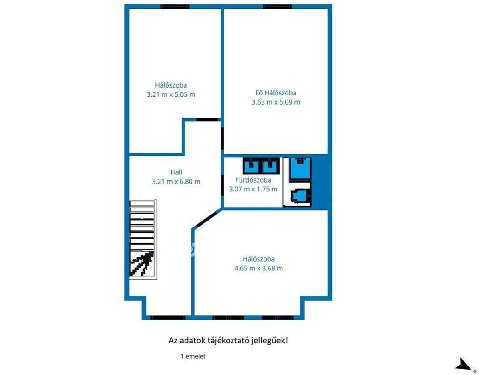 Öt különálló szoba, nappali, dolgozószoba, tágas konyha étkezővel, kamra, két fürdőszoba és külön wc áll rendelkezésre. A felső szint teljes értékű belmagassággal használható, a lakás nagy része frissen felújított állapotú. Az alsó szinten található vizes blokk és előtér felújítása az új tulajdonos elképzelései szerint alakítható, így nem kell kompromisszumot kötni a belső kialakítás során.
