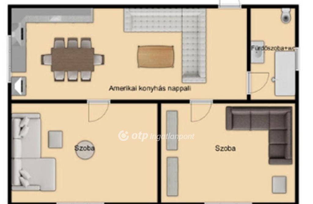 -a világos beltérben :2 szoba , amerikai konyhás nappali , és fürdőszoba+wc került kialakításra.