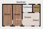 A napfényes és tágas terekkel rendelkező DUPLA-KOMFORTOS, KÉTSZINTES HÁZBAN a földszinten kialakításra került: két szoba, nappali, étkező, konyha, kamra, fürdőszoba, WC, előszoba, télikert. A télikertből van lehetőség lemenni a ház alatt található pincébe. Az emeleten található: három szoba, nappali, fürdőszoba WC-vel, szauna, terasz és loggia is. Az APARTMANHÁZ helyiségei: két szoba, konyha étkezővel, fürdőszoba WC-vel, kamra.
