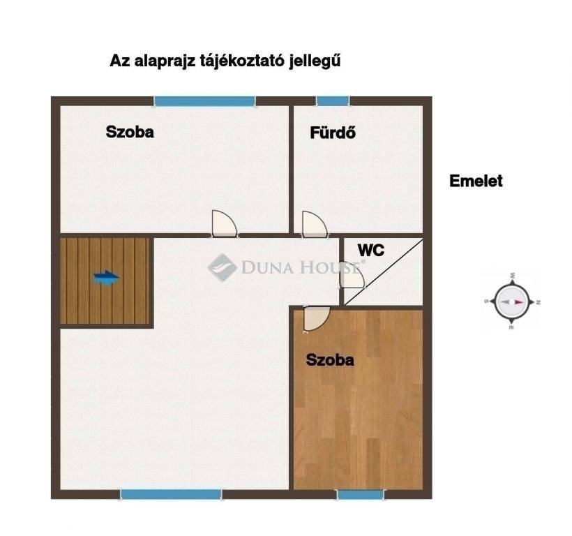 Az emeleten helyet kapott egy 34 egy 12 és egy 10 négyzetméteres szoba, fürdőszoba és egy tároló helyiség. A legkisebb szobából lehet kijutni az emeleti fedett teraszra.