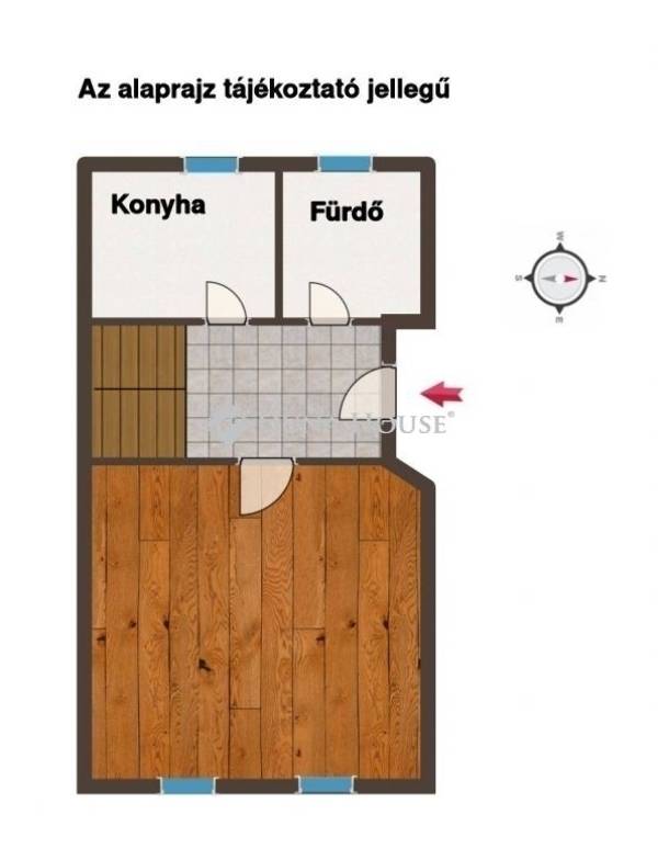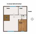 Az földszinten található egy 20 négyzetméteres szoba, fürdőszoba, konyha és egy kis kamra valamint a konyhából lehet kijutni a teraszra.