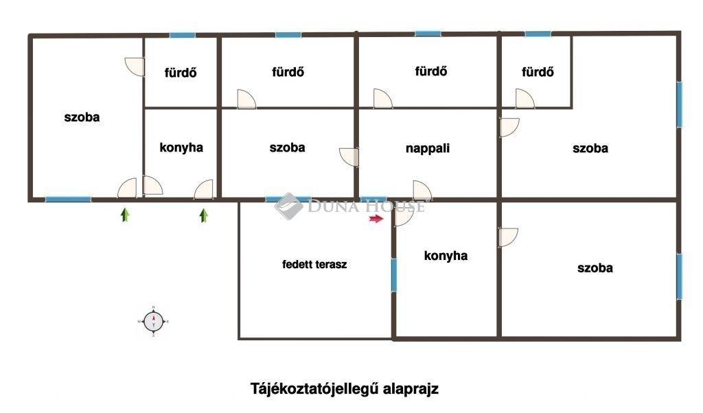 nappali, 4 szoba, 4 fürdőszoba, 2 konyha, fedett terasz