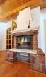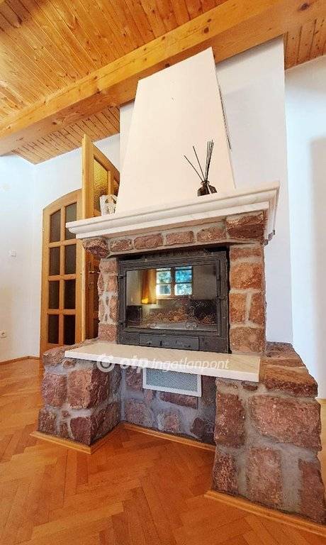 A vöröskő itt nem csak a ház külső homlokzatán lett része a balatoni hagyományos hangulatnak, hanem a klasszikus képnek a kandalló is része, ami vöröskő berakásokkal készült, és a nappali impozáns és látványos éke.