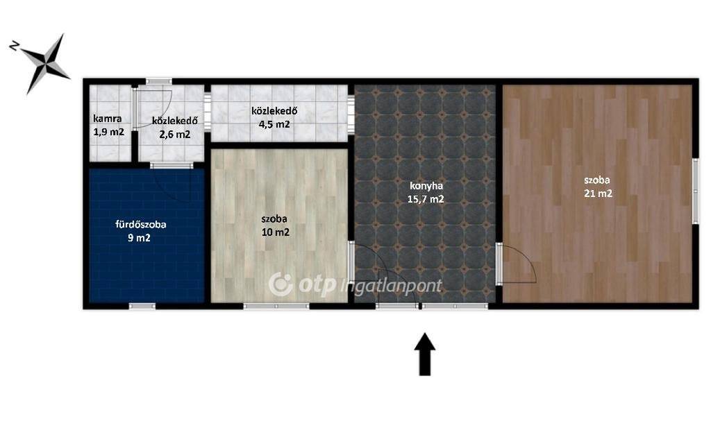 Az épület elosztása két szoba, konyha-étkező, közlekedők, kamra, és fürdőszoba.