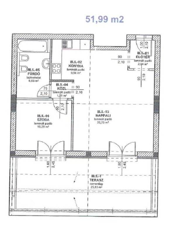 Az 52 m2-es lakóterületű lakás nappali, - konyha, 1 szoba, fürdő, WC helyiségekkel és óriási 25 m2-es terasszal rendelkezik. Az ablakok elektromos redőnnyel szereltek.