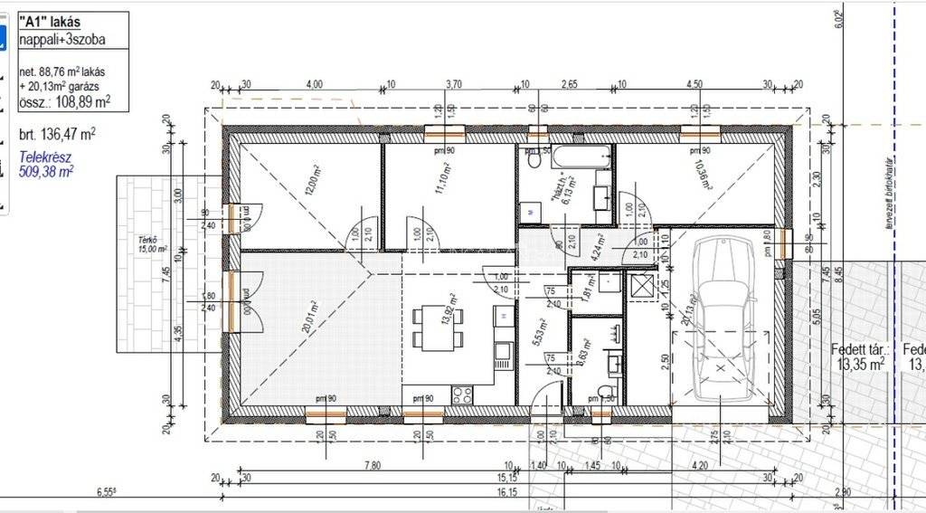 Gépkocsi beálló fedése, terasz télikerté alakítása opcionálisan kérhető.
