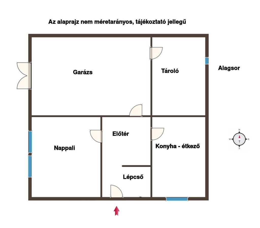 Az épület alagsorában helyezkedik el a garázs, mely közvetlenül az utca felől, kétszárnyú kapun közelíthető meg.
