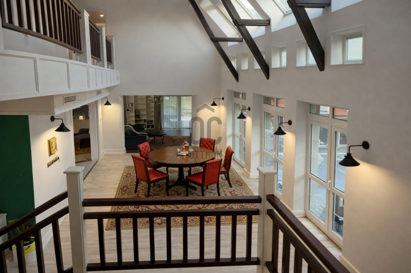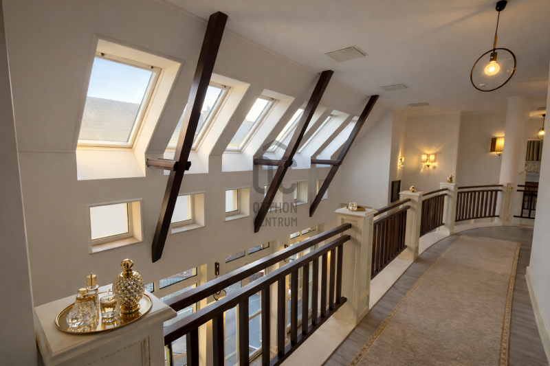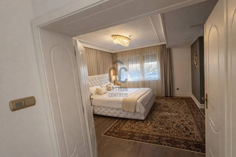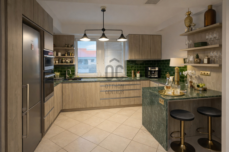 Az ingatlan egyik legkülönlegesebb eleme a lenyűgöző, 5,8 méteres belmagasságú étkező-nappali tér, amely villa hangulatot teremt.